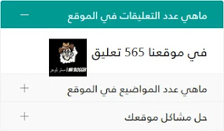 <ul data-uk-accordion=""><li><a class="uk-accordion-title" href="#">ماهي عدد التعليقات في الموقع</a><div class="uk-accordion-content"> في موقعنا 565 تعليق</div></li><li><a class="uk-accordion-title" href="#">ماهي عدد المواضيع في الموقع</a><div class="uk-accordion-content">في موقعنا 420 موضوع</div></li><li><a class="uk-accordion-title" href="https://www.mrarabko.com/p/p.html">حل مشاكل موقعك</a><div class="uk-accordion-content"> عن طريق وضع المشكلة في صفحة اسألنا</div></li></ul>